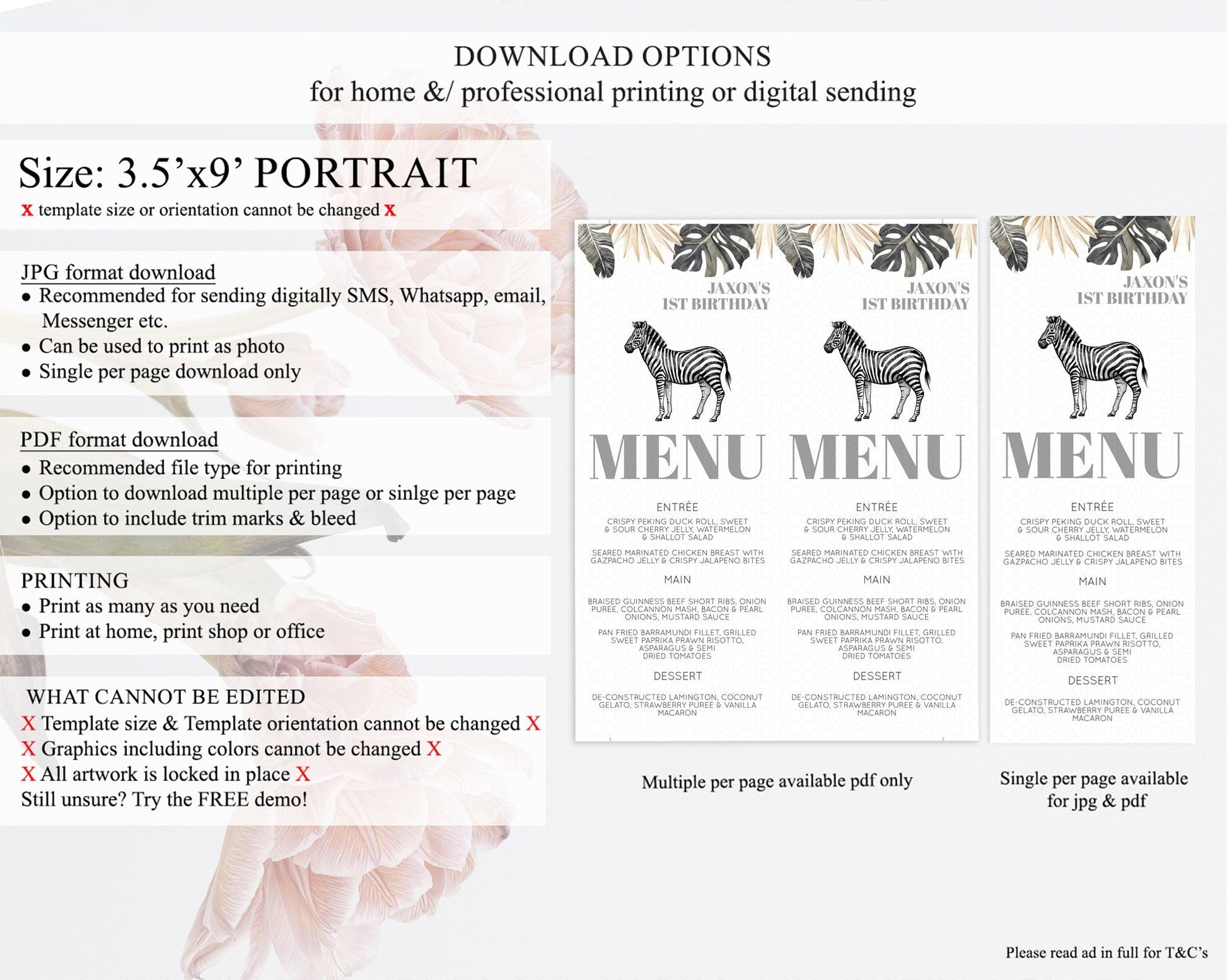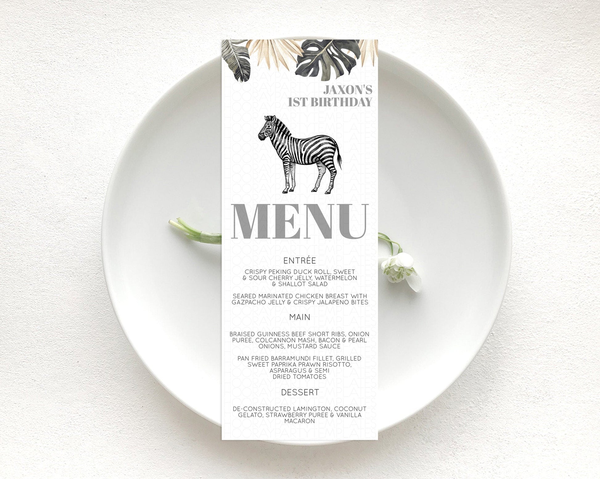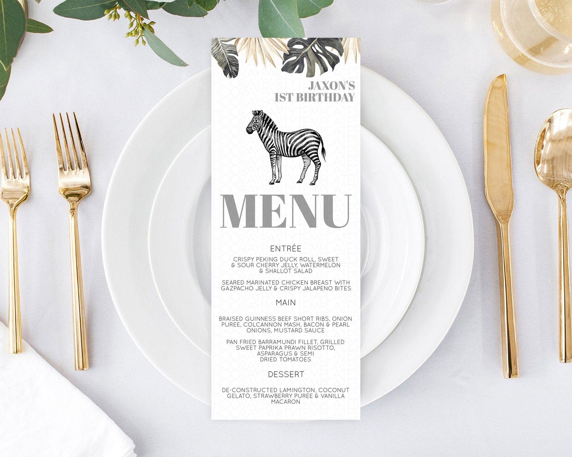 Zebra Menu Zebra Menu Template Zebra Party Table Decor Safari Adventure Decor Zebra Dinner Dessert Menu Party Food Menu D10824